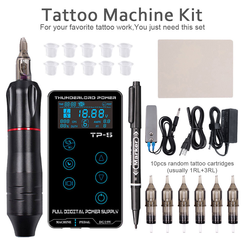 This machine kit comes with 20 cartridges, practice skin, grip, and all the necessary power equipment.